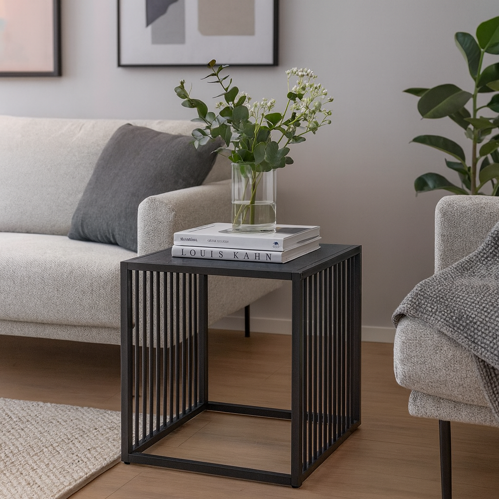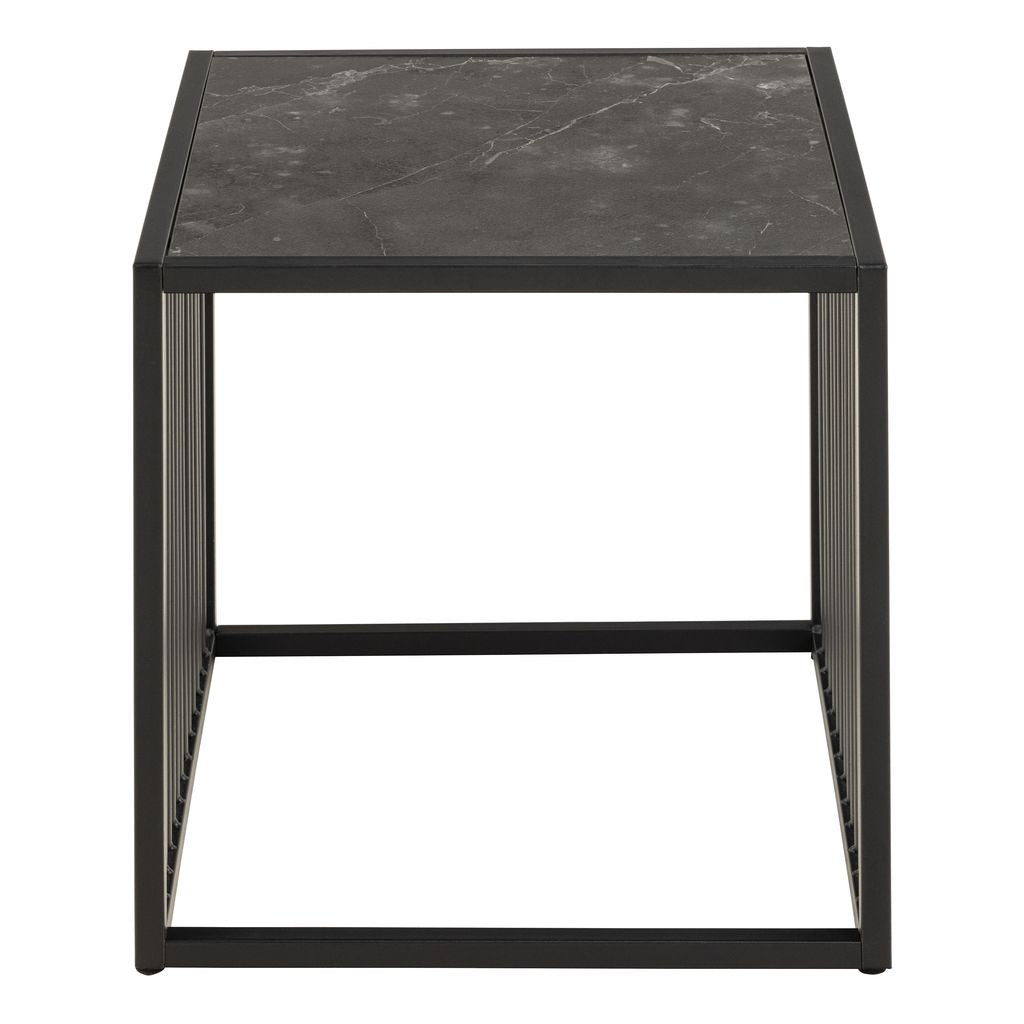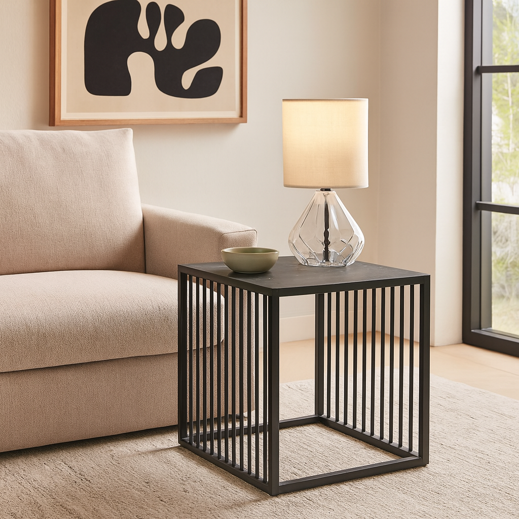 Add a modern accent to your space with the Strington Side Table, featuring a rough matte black marble-look top and a steel wire base with vertical slat detailing. Its compact square design and clean lines offer a minimalist yet striking presence—perfect for contemporary, industrial, or monochrome interiors.
