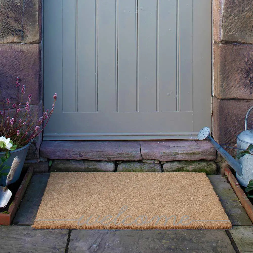 Create a warm, inviting entrance with our extra-large Country Welcome Doormat, featuring the word “Welcome” in a timeless serif font. The soft grey text adds understated elegance, complementing a wide range of home styles, from rustic cottages to modern country homes.