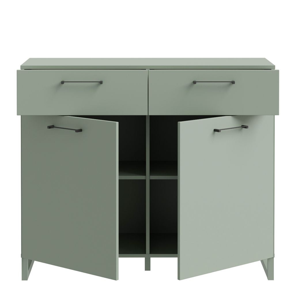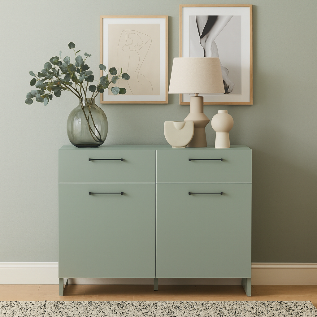 Bring home understated charm with the Sali 2 Door 2 Drawer Chest in soothing Sage Green. Thoughtfully designed to balance elegance and practicality, this compact piece is perfect for living rooms, hallways, or cozy reading nooks. Its soft green finish radiates calm, while sleek black metal handles add a modern edge.