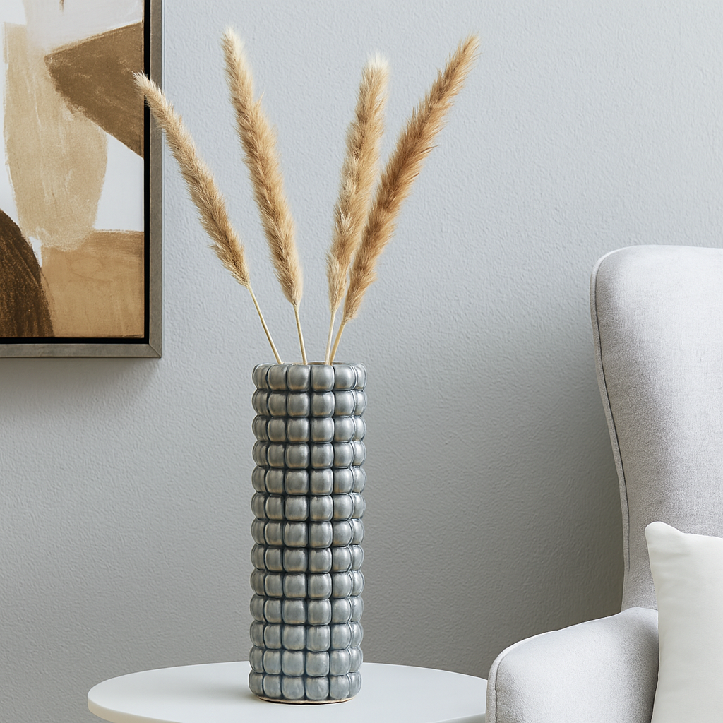 Handcrafted in ceramic, this sculptural vase features a bold all-over bubble texture and a soft grey glaze that complements a wide range of interiors. Its tall, narrow form is ideal for showcasing statement stems or adding height to shelf and console styling. A standout piece that pairs effortlessly with natural materials and neutral palettes.