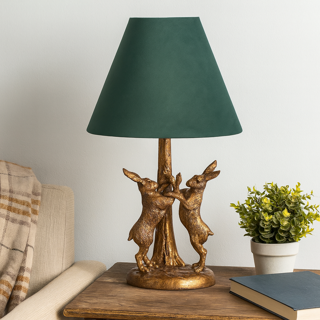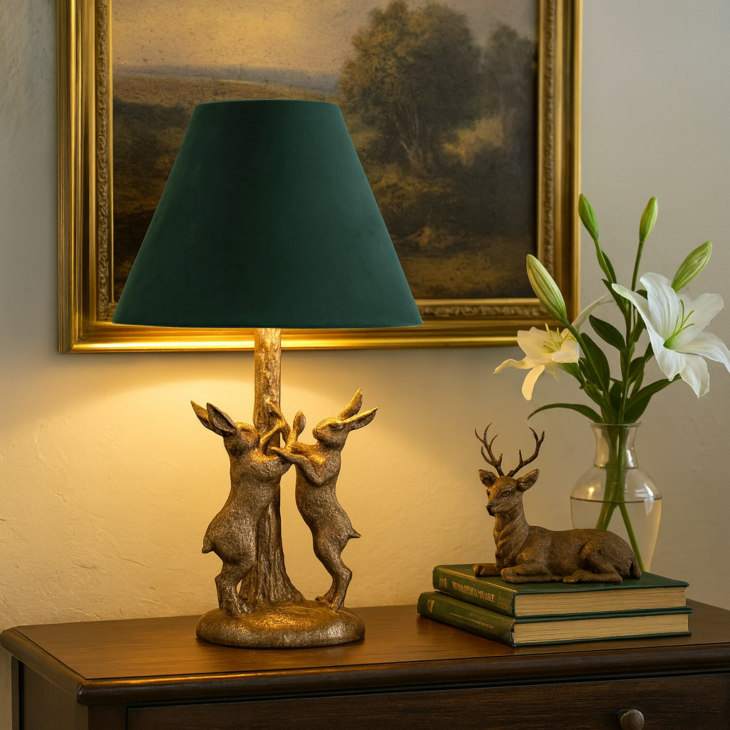 Characterful and entirely unique, this handcrafted lamp features a trio of antique gold hares in a statuesque marching formation. Topped with a rich green velvet shade, it blends whimsical charm with elegant detailing, making it a standout focal point in cottagecore, traditional, or eclectic interiors.